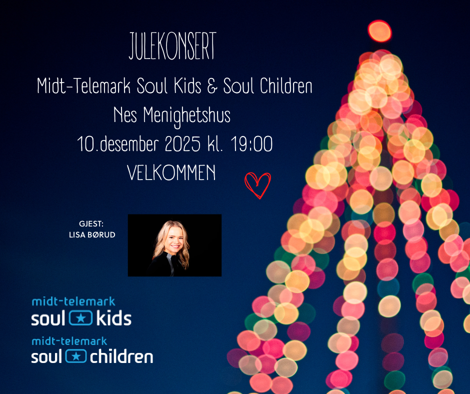 10. desember kl. 19.00 Nes menighetshus: Midt-Telemark Soul Children og Soul Kids har konsert sammen med Lisa Børud. Bilettar her